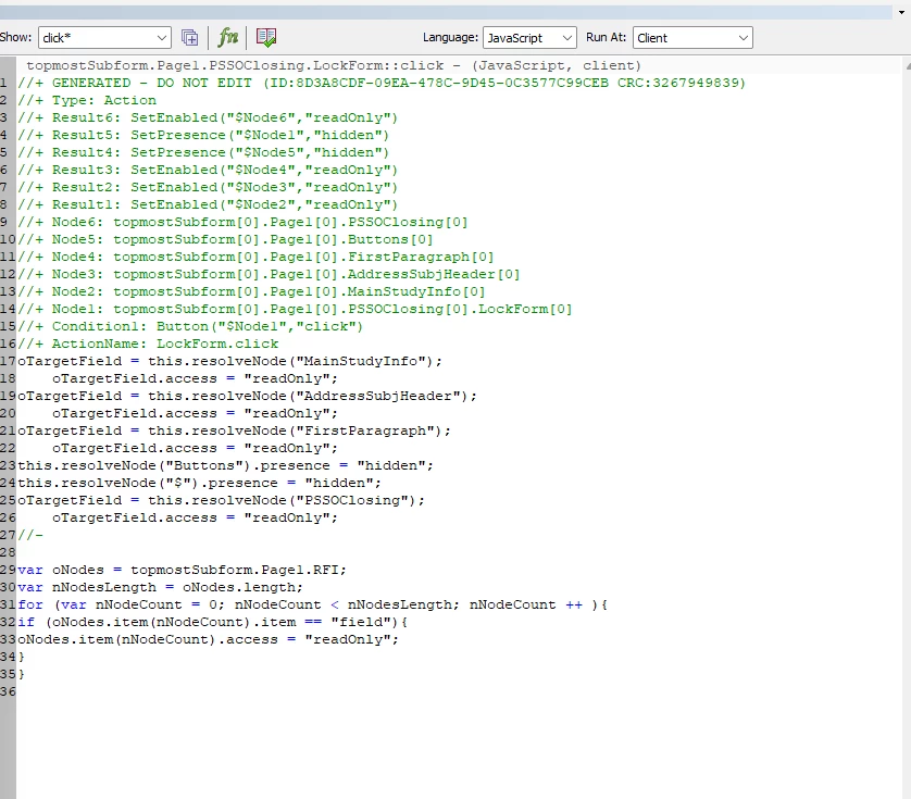 if (_comments.count == 0) {// The count property specifies the current number // of instances instantiated. _comments.setInstances(1); // Add the comments subform. this.resolveNode("caption.value.#text").value = "Clear Comments"; Change the button's caption. } else { _comments.setInstances(0); // Remove the comments subform. this.resolveNode("caption.value.#text").value = "Add Comments"; Change the button's caption. } // //