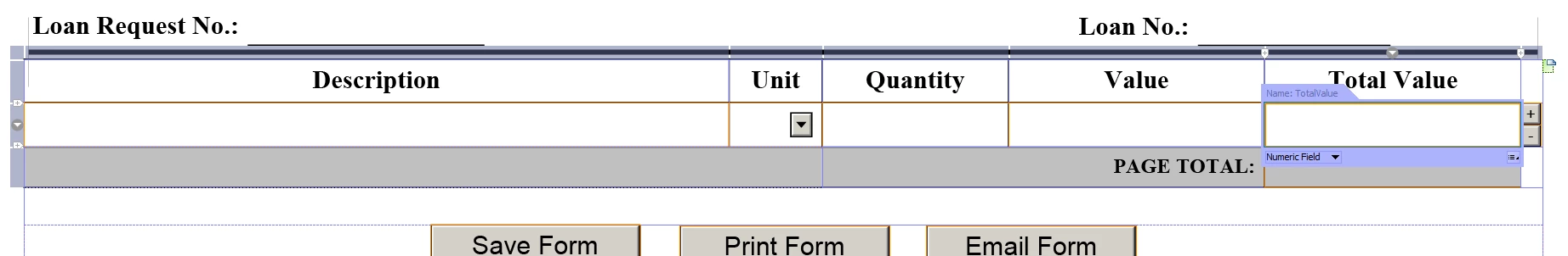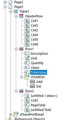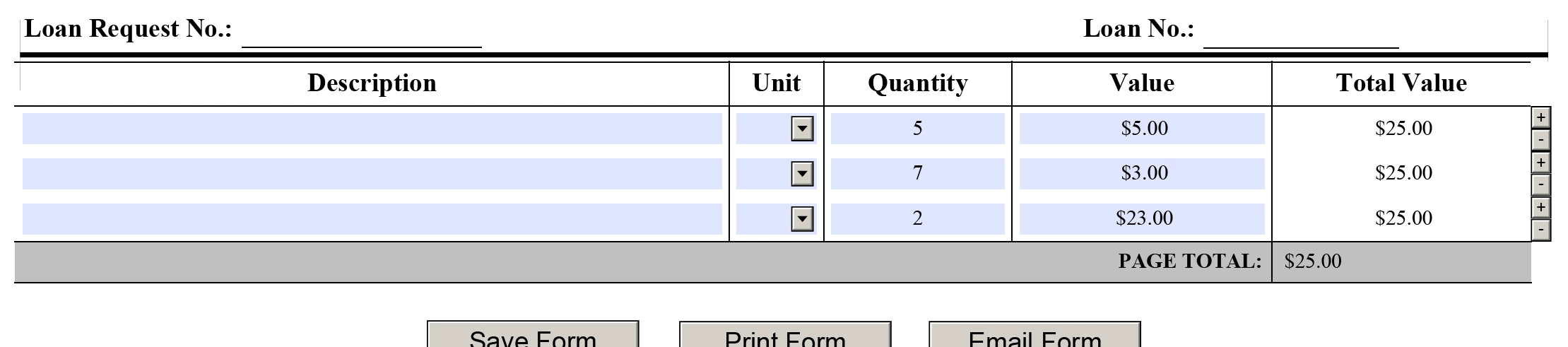 What code should I be using for the Total Value column to total each row and then the Page Total row at the bottom to add up all of the rows in the Total Value column? I know the easiest way is with FormCalc but everything I've tried has duplicated the values from the previous row to the new row when the Add '+' button is clicked.