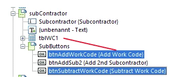 Instead of using resolveNode starting at the button (this) to then reference to the its parent parent "subContractor" and then refer to the instanceManagager (_) of its child element (tblWC1)
