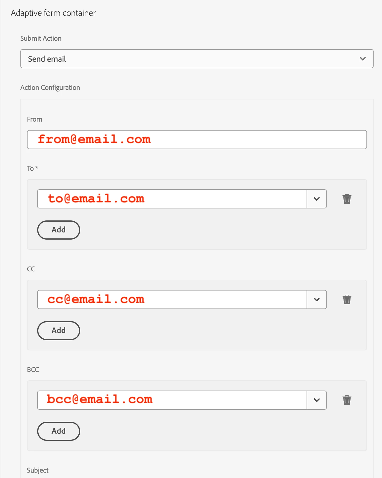 I am using the out-of-the-box "Send email" Submit Action for my Adaptive Form. When adding a value for the "CC" and "BCC" fields in my Adaptive Forms, they do NOT send the notification to the emails provided in the "CC" or "BCC" fields. Notifications only get sent to the email provided in the "TO" field.