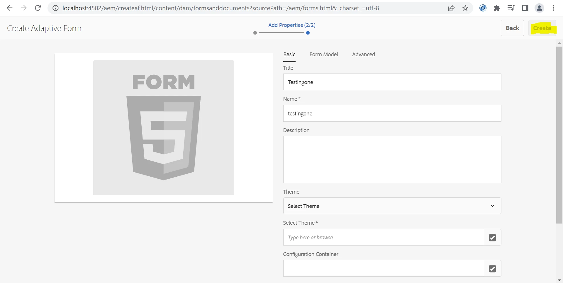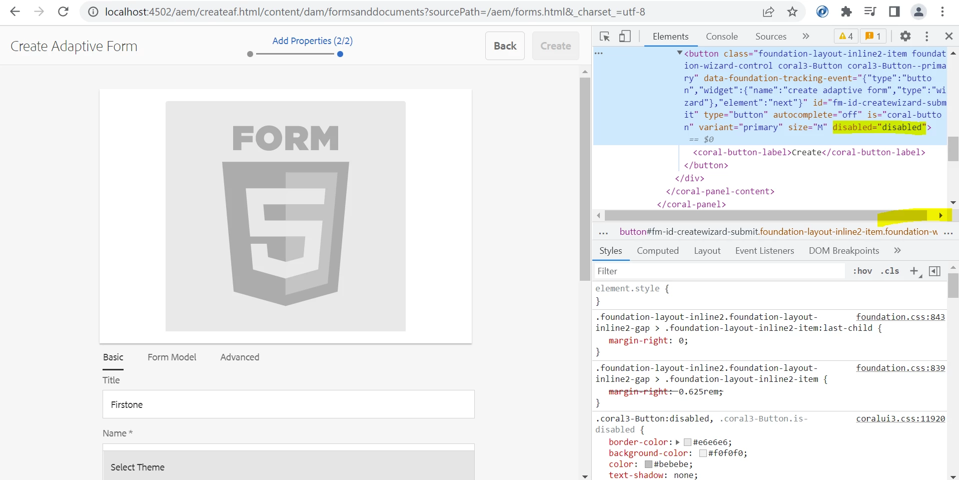 I was trying to create new basic form by providing title and name i was supposed to click Create button observed like Crete button is not enabling below is screen shot for same which i have tried and i saw error.log file as well nothing is printing as error.