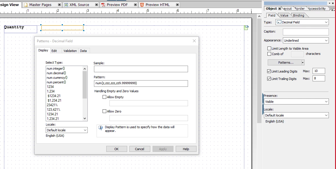 I am trying to give 10 leading and 8 trailing digits in a decimal field. I am using "num{z,zzz,zzz,zz9.99999999}" as Display and Data pattern and have limited the leading and trailing digits to max 10, 8 respectively under the Object palette > Field settings.