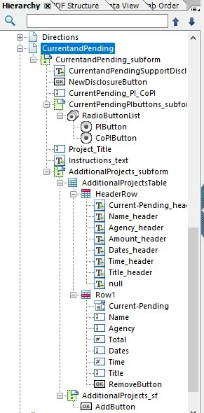 There is a subform on this page (CurrentandPending_subform) which contains all the elements I'd like to have on the duplicate page. This includes other subforms and a dynamic table and other elements.