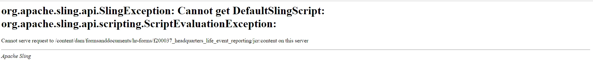 org.apache.sling.engine.impl.SlingRequestProcessorImpl service: Uncaught SlingException org.apache.sling.scripting.sightly.SightlyException: org.apache.sling.api.SlingException: Cannot get DefaultSlingScript: org.apache.sling.api.scripting.ScriptEvaluationException: at com.adobe.cq.sightly.WCMScriptHelper.includeScript(WCMScriptHelper.java:227) [com.adobe.cq.sightly.cq-wcm-sightly-extension:1.6.0] at com.adobe.cq.sightly.internal.extensions.IncludeExtension.call(IncludeExtension.java:72) [com.adobe.cq.sightly.cq-wcm-sightly-extension:1.6.0] at org.apache.sling.scripting.sightly.impl.engine.runtime.RenderContextImpl.call(RenderContextImpl.java:77) [org.apache.sling.scripting.sightly:1.1.2.1_4_0] at org.apache.sling.scripting.sightly.libs.fd.af.components.page2.aftemplatedpage.afpagecontent_html.render(afpagecontent_html.java:113) at org.apache.sling.scripting.sightly.render.RenderUnit.render(RenderUnit.java:50) [org.apache.sling.scripting.sightly.runtime:1.1.0.1_4_0] at org.apache.sling.scripting.sightly.impl.engine.SightlyCompiledScript.eval(SightlyCompiledScript.java:60) [org.apache.sling.scripting.sightly:1.1.2.1_4_0] at org.apache.sling.scripting.core.impl.DefaultSlingScript.call(DefaultSlingScript.java:386) [org.apache.sling.scripting.core:2.3.2] at org.apache.sling.scripting.core.impl.DefaultSlingScript.eval(DefaultSlingScript.java:184) [org.apache.sling.scripting.core:2.3.2] at org.apache.sling.scripting.core.impl.DefaultSlingScript.service(DefaultSlingScript.java:491) [org.apache.sling.scripting.core:2.3.2] at com.day.cq.wcm.tags.IncludeTag.includeScript(IncludeTag.java:178) [com.day.cq.wcm.cq-wcm-taglib:5.13.8] at com.day.cq.wcm.tags.IncludeTag.doEndTag(IncludeTag.java:95) [com.day.cq.wcm.cq-wcm-taglib:5.13.8] at org.apache.jsp.libs.fd.af.components.page2.aftemplatedpage.aftemplatedpage_jsp._jspx_meth_cq_005finclude_005f2(aftemplatedpage_jsp.java:512) at org.apache.jsp.libs.fd.af.components.page2.aftemplatedpage.aftemplatedpage_jsp._jspService(aftemplatedpage_jsp.java:408) at org.apache.sling.scripting.jsp.jasper.runtime.HttpJspBase.service(HttpJspBase.java:70) [org.apache.sling.scripting.jsp:2.3.6] at javax.servlet.http.HttpServlet.service(HttpServlet.java:764) [org.apache.felix.http.servlet-api:1.2.0] at org.apache.sling.scripting.jsp.jasper.servlet.JspServletWrapper.service(JspServletWrapper.java:502) [org.apache.sling.scripting.jsp:2.3.6] at org.apache.sling.scripting.jsp.jasper.servlet.JspServletWrapper.service(JspServletWrapper.java:449) [org.apache.sling.scripting.jsp:2.3.6] at org.apache.sling.scripting.jsp.JspScriptEngineFactory.callJsp(JspScriptEngineFactory.java:339) [org.apache.sling.scripting.jsp:2.3.6]