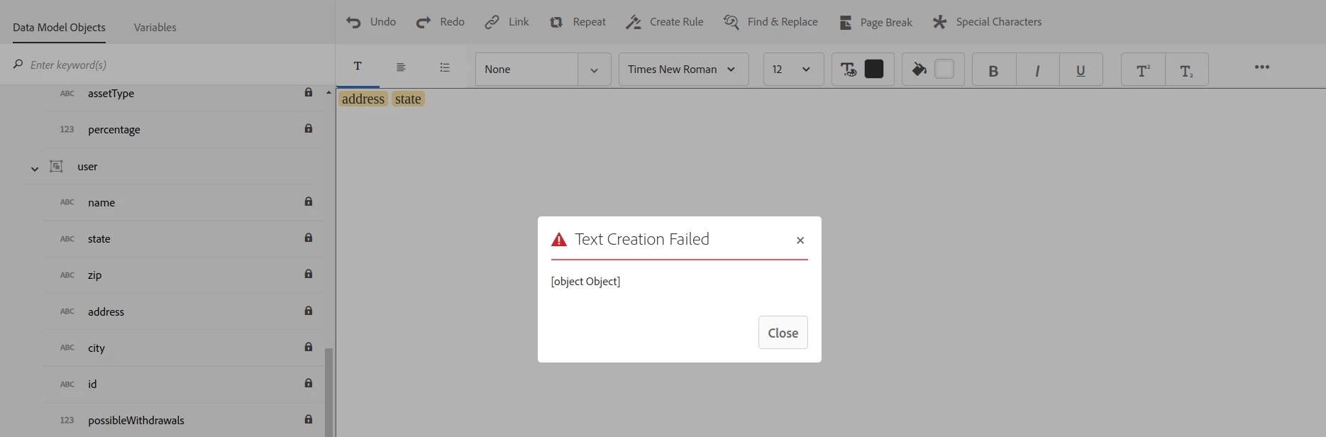 - On saving it is failing with error [object Object]. Log shows following error. Screenshot attached too.
