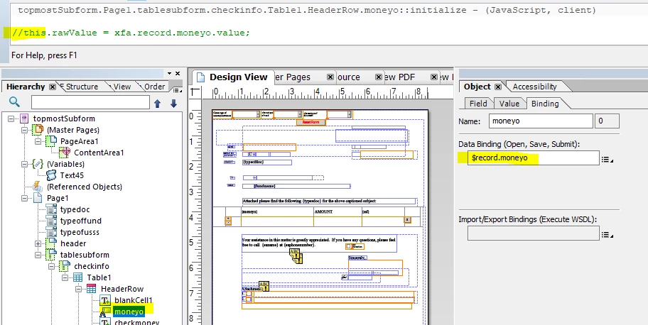 Hi, I have replied to my previous question and have not received an answer so I'm reposting my issue here because I'm not sure if my replies are being seen by anyone. My issue has not been rectified so please let me be more specific about my issue. On my form, I have a drop down box listing choices. The item chosen from the drop down list is populated into a floating field which is in the header of a table. When the table flows to the next page, the headers of the table flows to the next page as well. My problem is that the information that is in the floating field of the header on the first page does not move to the next page. The header box on the next page is empty. The answer I received is still not working and I have additional questions. Maybe this explanation is better and will result in a fix. Your help is greatly appreciated.