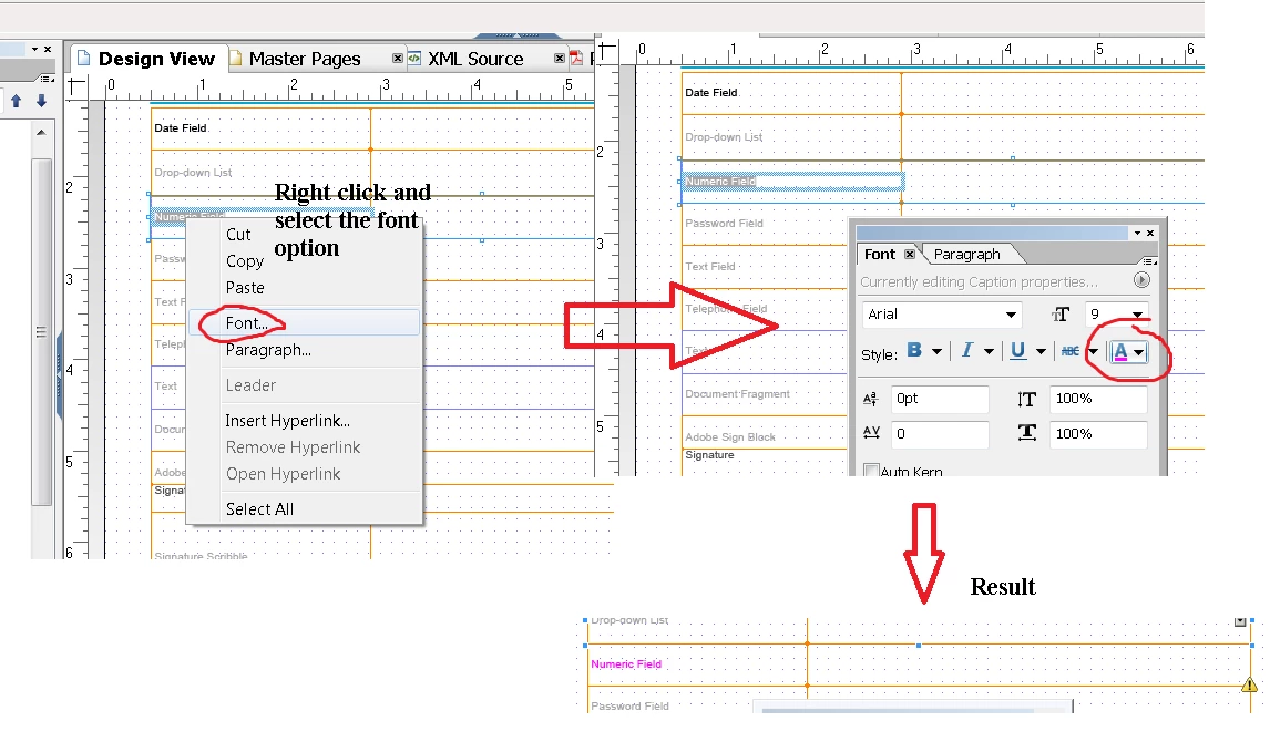 The XDP template in Designer has no place to change the font color, neither does the OSGi interface.