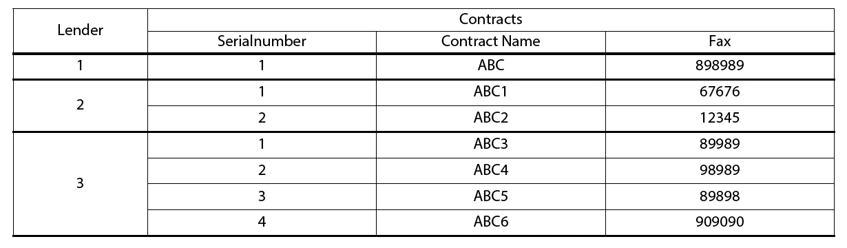 Each lender has multiple contracts, all the contracts to be listed is the output required. I have tried out lot of options but its not working. Kindly help