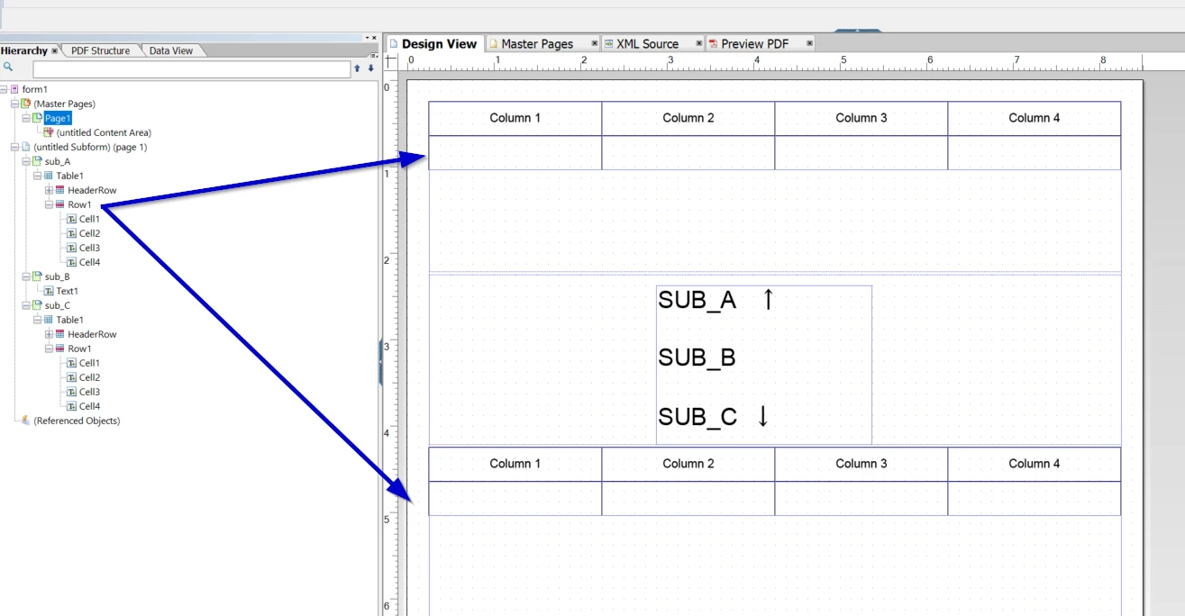 Furthermore, if the first subform need overflow, it should be printed to a second page with the same layout of the first page. So the third subform of the second page must be an exact copy of the first subform of that second page too Etc.