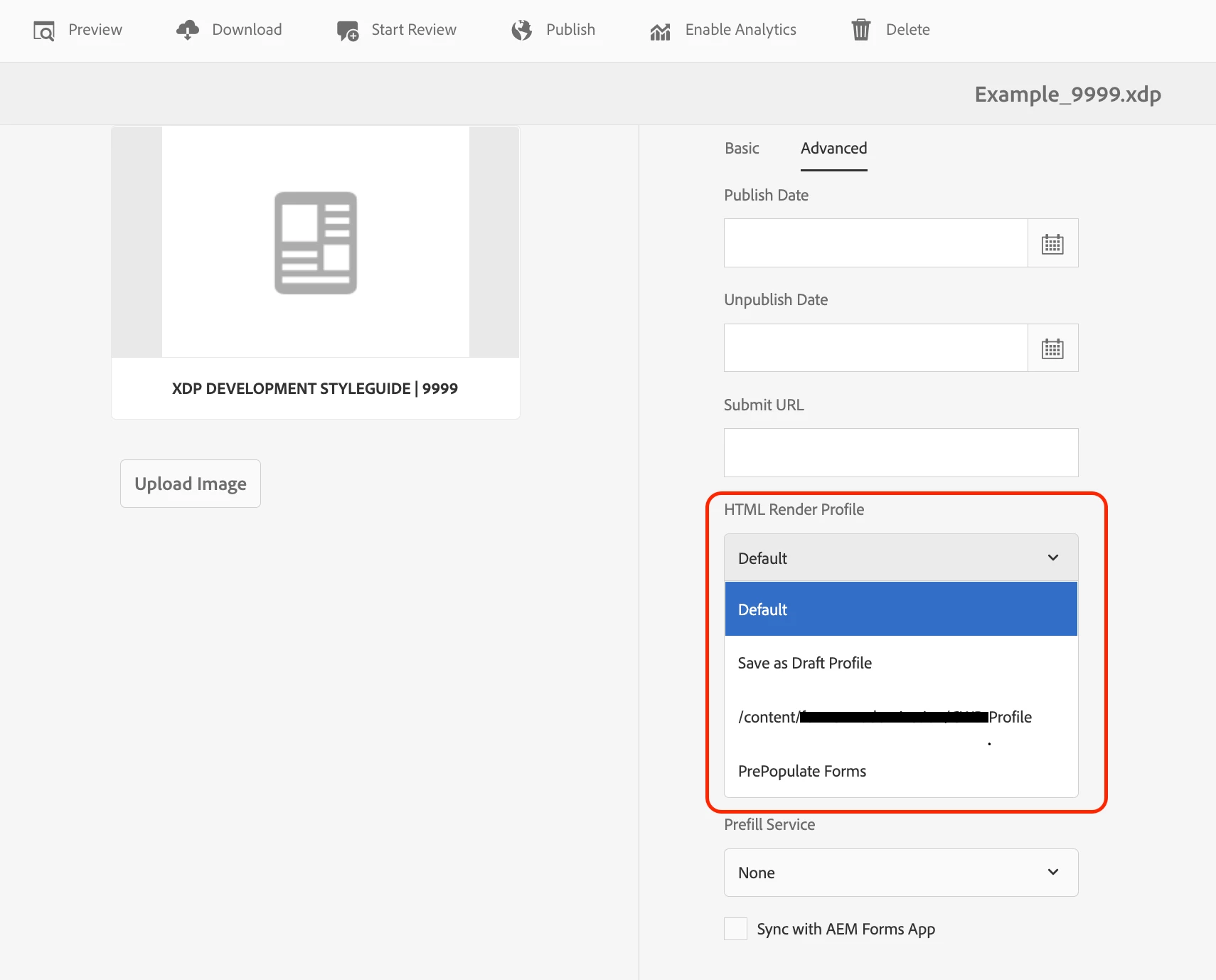 When we upload a form XDP, we have to individually change the HTML Render Profile from the default, to our custom profile in order to enable our custom features. This is done by going to the uploaded XDP properties in AEM, selecting the Advanced tab and choosing our profile from the HTML Render Profile dropdown: