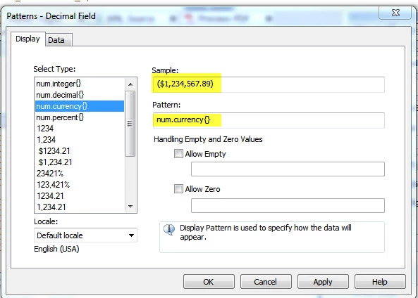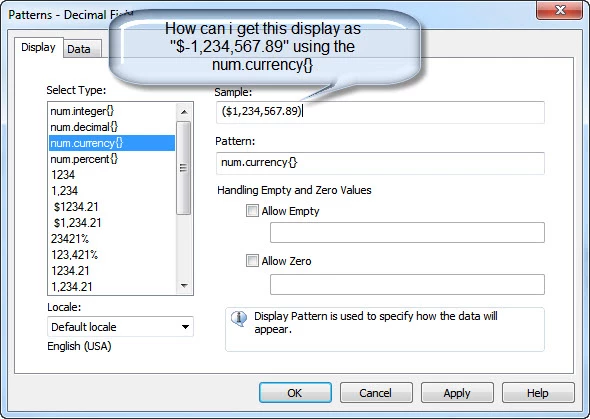 I am using Display pattern num.currency{}, but its displaying it as ($1,234,567.89), I want this to display as $-1,234,567.89