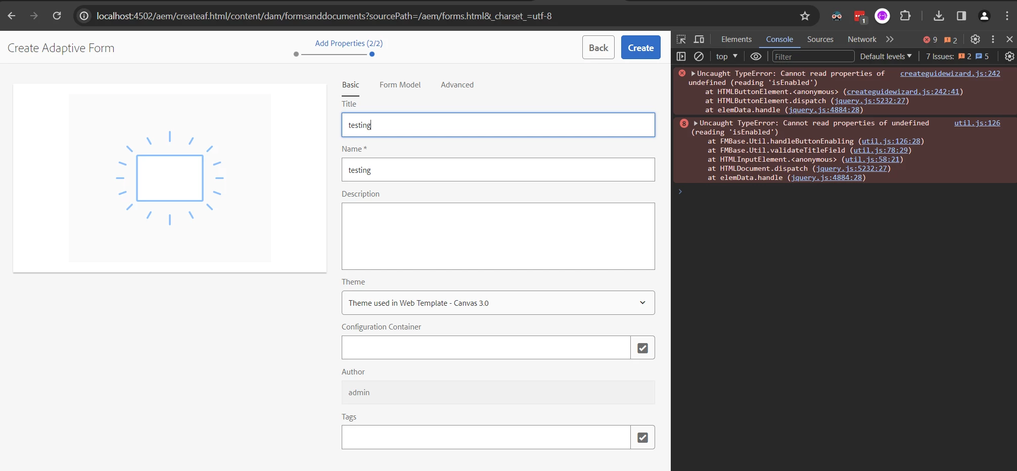 Just trying to evaluate AEM Forms, but keep running into problems. Whenever I try to create a new Adaptive Form, clicking the blue Create button fails to submit because of a jQuery error. I also get other jQuery errors when interacting with the create form. Such as when typing in the Title field. I attached a screenshot showing the errors in the javascript console.