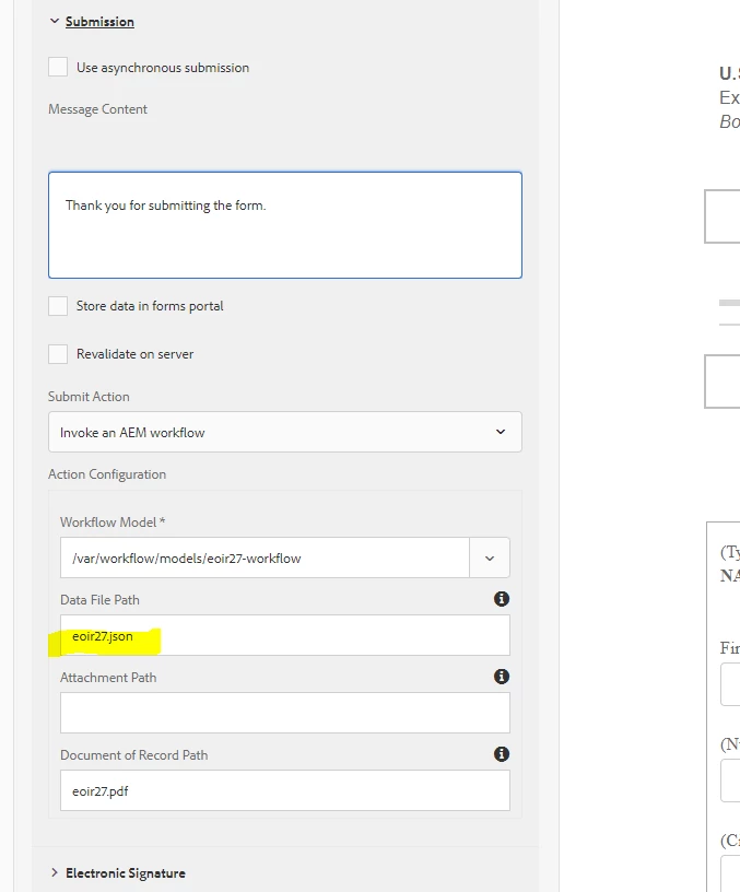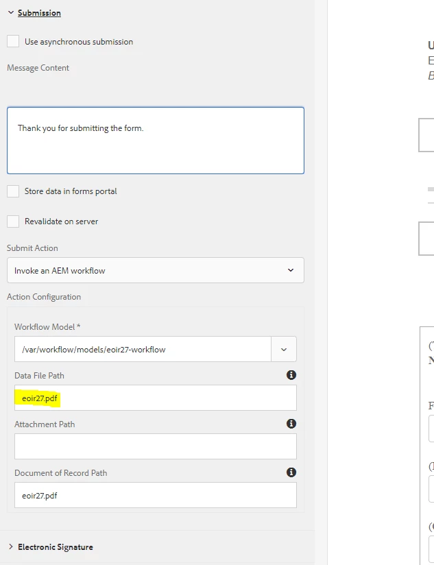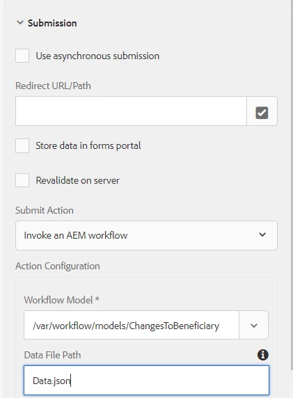 Configure your AF to invoke AEM Workflow  The Data File Path is the name of the file that will store the data from the AF submission.
