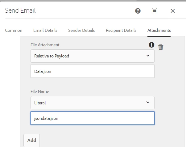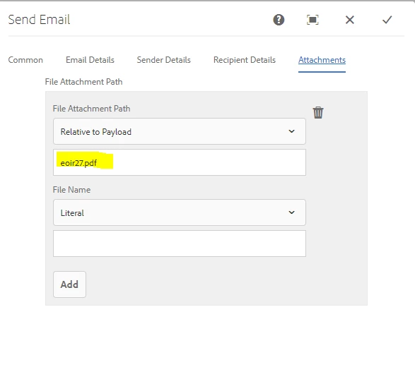 workflowuser​ yes I got the json file. before the data file path was eoir27.pdf and I when submit it would send the pdf on the email. can it only send one of them??? :-O ! I need bothhhhh in the emailllll