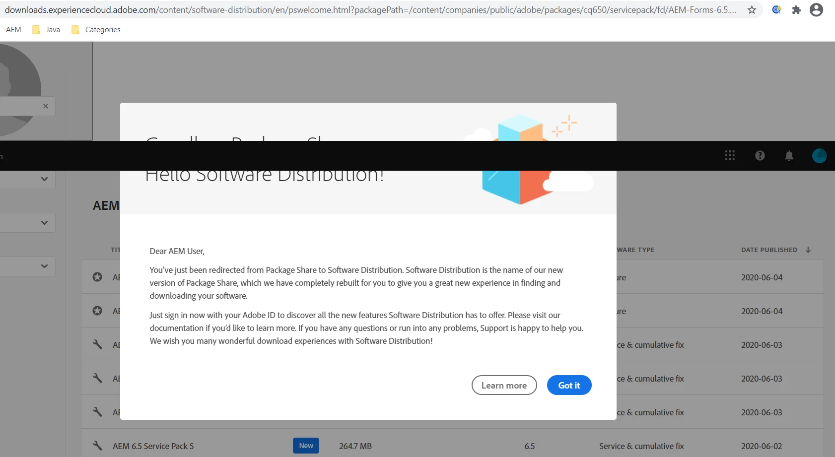 I am getting redirected to https://downloads.experiencecloud.adobe.com/content/software-distribution/en/pswelcome.html?packagePath=/content/companies/public/adobe/packages/cq650/servicepack/fd/AEM-Forms-6.5.3.0-WIN.