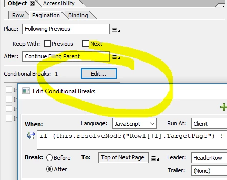The conditional break in this sample is defined on the table row object, and triggers a page throw every time the target page column changes