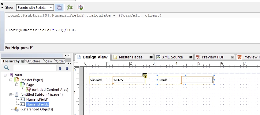 formula using in FormCalc (Calculate) "$=SubTotal*5/100"