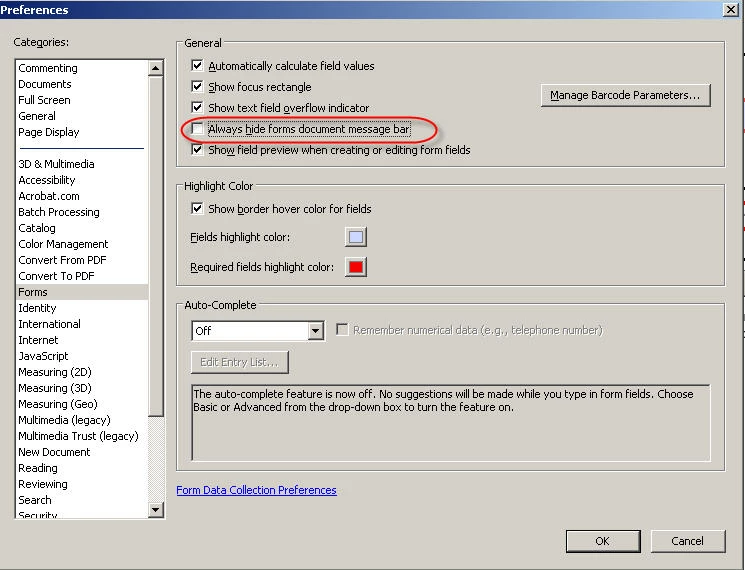 Hi, all. When my form is opened in Adobe Reader, there is a default purple banner at the top that says: Please fill out the following form. If you are a form author, choose Distribute Form in the Forms menu to distribute it to your recipients.
