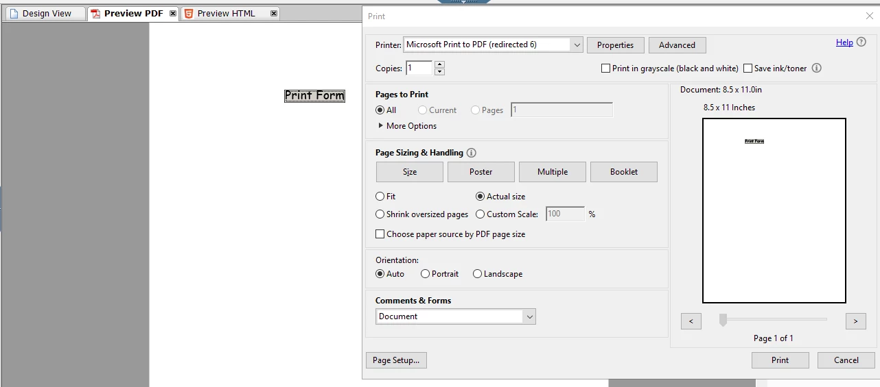 I am facing issue with print button functionality for preview HTML in designer, whereas it is working fine in Preview PDF.