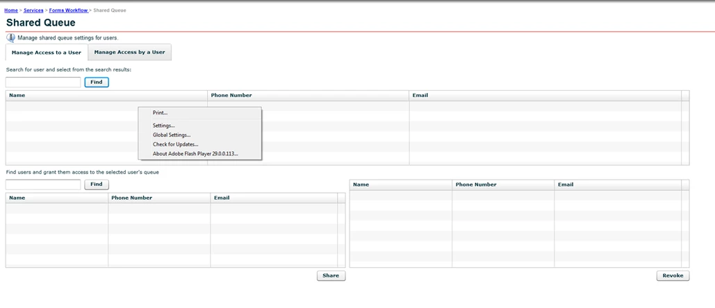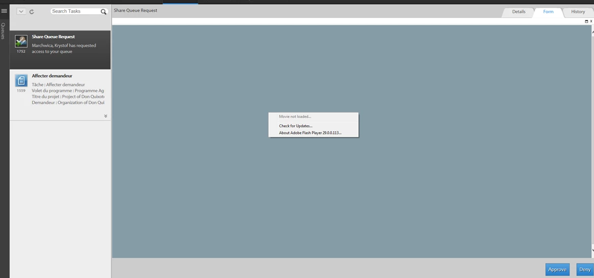 In AEM Forms Workspace, when User A requests access to the queue of User B, User B gets an email notification with "Share Queue Request" in the subject line. Clicking the link opens AEM Forms Workspace with a new item in the TO DO list of User B. That item is associated with some sort of Flash interface that isn't loading. Right clicking on it shows "movie not loaded". I'm trying this in IE as well as Firefox. Neither works. I've also tried different settings on IE compatibility view with no luck.