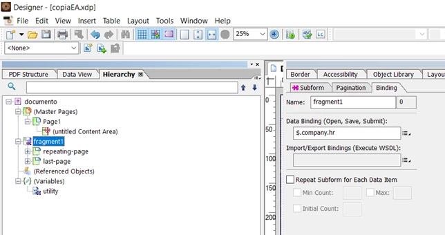 The first repeating subform (no matter if in fragment or directly placed in the design) will depleat your data which is run through from top to bottom during render and never goes back to the beginning. Should subform 1 only read 2 elements, subform 2 would get the one left. But as your subforms dynamically use all employees records subform 2 will never get anything. That you still see one empty has to do with the fact that normally minimum one instance of the subform is thrown but no data for your fields are there.