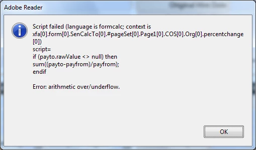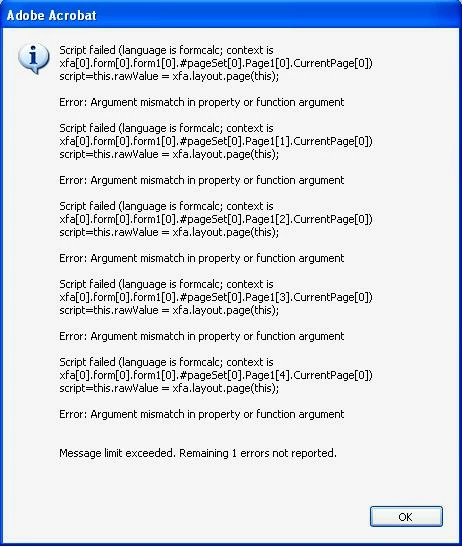 I temporarily switched from JavaScript to FormCalc just to see what functions were available. It didn't have what I was looking for, so I did not add any functions, I just browsed, then I switched back to JavaScript. However, now when I view my PDF I get the following error messages which were not there before: