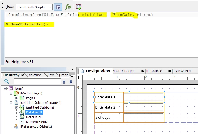 I have one date that is automatically populated with the current date, and another (earlier) date that the user enters. I need to have a field which calculates the difference between these 2 dates in days.