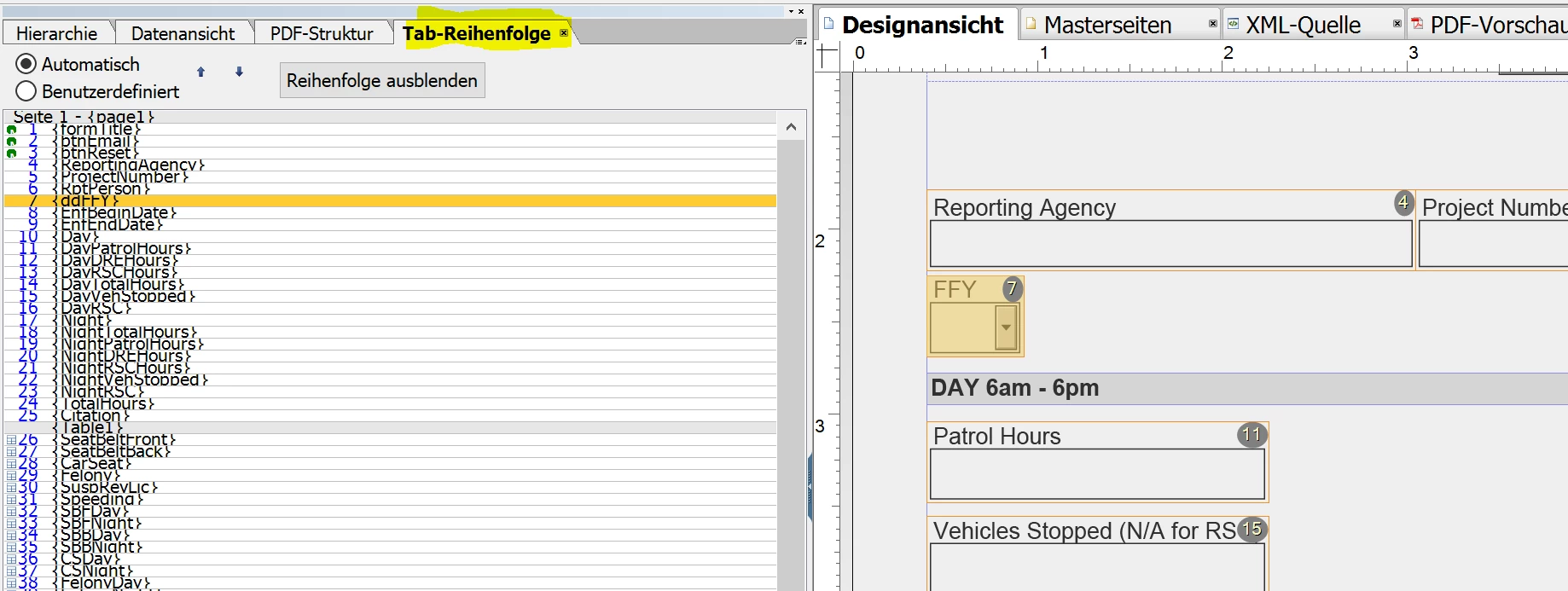 I have a form that has 2 subforms with 2 fields in each. The subforms are each hidden and become visible based on information entered in a defined field. I have set the tab order to include the fields in each of these subforms but the tabbing does not work. I don't even know if this is something possible. Subs are Sub22 and Sub 23. If the FFY field is set at 23 then Sub 23 appears and the order should be FFY, Campaign, Enforcement, Date. The same for Sub 22 if FFY is set at 22. Only one sub can be showing at any one time.