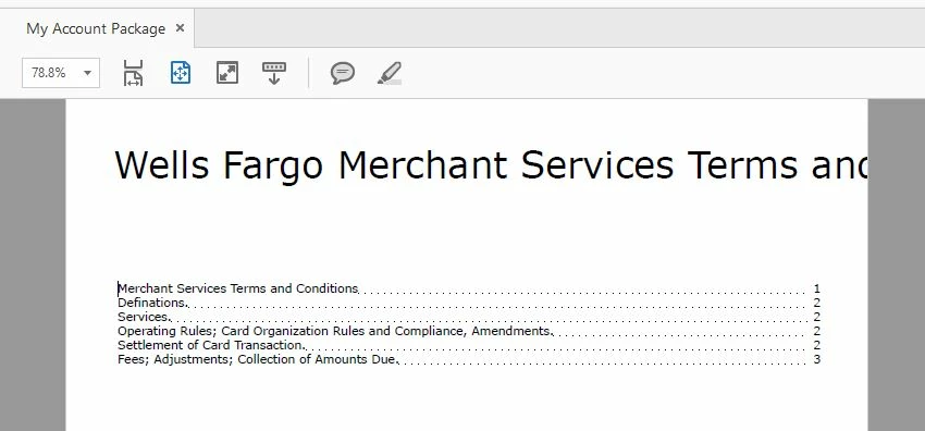 "<?xml version="1.0" encoding="UTF-8"?> <DDX xmlns="http://ns.adobe.com/DDX/1.0/"> <PDF result="out.pdf"> <TableOfContents includeInTOC="true" bookmarkTitle="_SourceTitle" toc-margin-top="70pt"> <PageSize width="612pt" height="792pt"/> <Header><Left><StyledText><p font-family="Verdana" font-size="28pt" text-align="left">Wells Fargo Merchant Services Terms and Conditions</p></StyledText></Left></Header> <TableOfContentsEntryPattern> <StyledText> <p font-family="Verdana" font-size="9pt"> <_BookmarkTitle/><leader leader-pattern="dotted"/> <_BookmarkPageCitation/></p> </StyledText> </TableOfContentsEntryPattern> </TableOfContents> <PDF source="sourceDoc"> <NoForms/> <NoXFA/> </PDF> </PDF> <StyleProfile name="headerStyle"> <Header> <Left> <StyledText> <p>_SourceTitle</p> </StyledText> </Left> </Header>
