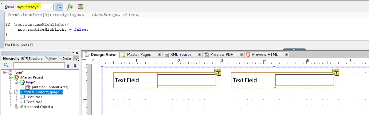 The documents are for example, contact sheets that colleagues can complete and then email to clients with all our contact information etc. When viewing the pdf in Adobe Acrobat, the editable text fields display the blue field highlight to show where to type. This is fine if we are printing the document as it is then no longer visible but when emailing the document it is not ideal as the highlights still show and it isn't aesthetically pleasing in the design. I have used code before on a standard PDF to remove the highlighting (added to javascript in acrobat), however when I create the document in AEM Designer / Livecycle and it exports a dynamic pdf, I am unable to add the javascript in Acrobat. Please can someone advise if I can add a script in AEM forms or if there is a predefined action and if so how do I do it as I am lost. Thanks in advance all.