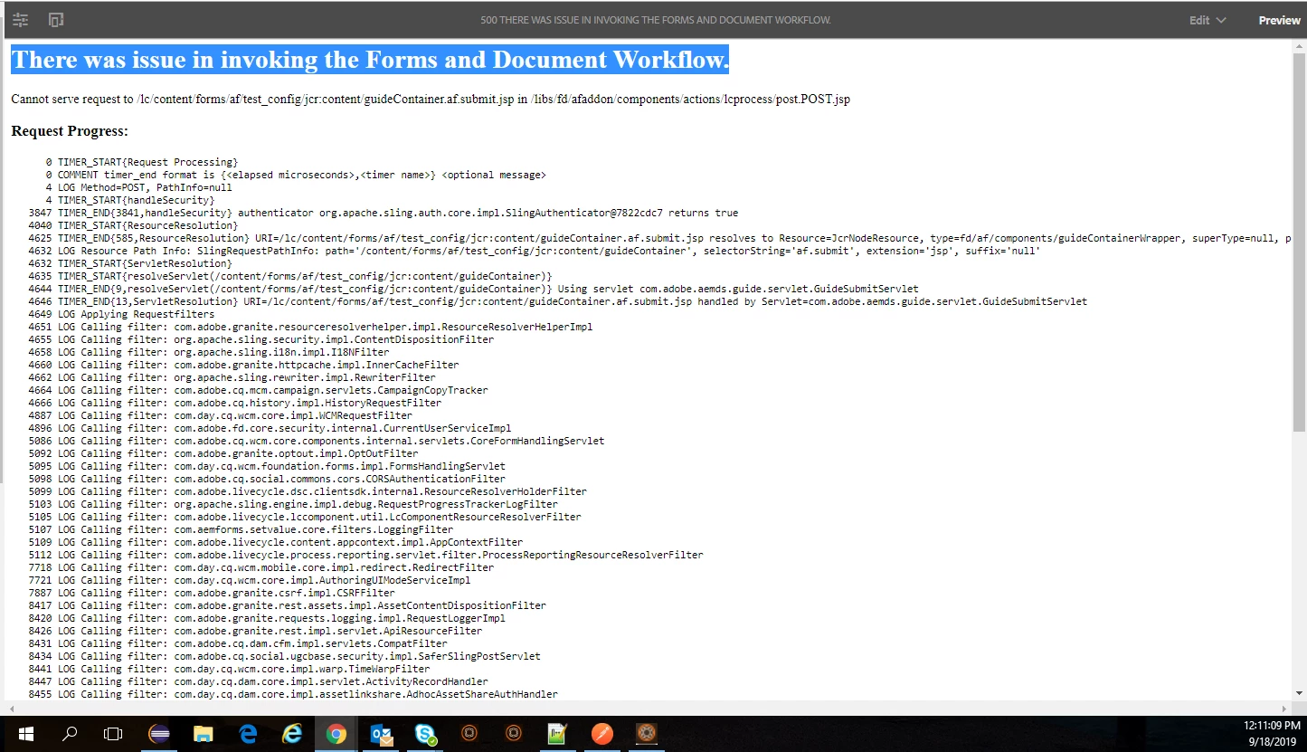 23.09.2019 10:42:29.233 *ERROR* [172.31.179.83 [1569249748966] POST /lc/content/forms/af/ops_test_1/jcr:content/guideContainer.af.submit.jsp HTTP/1.1] com.adobe.aemds.guide.servlet.GuideSubmitServlet Could not complete Submit Action due to Response already committed