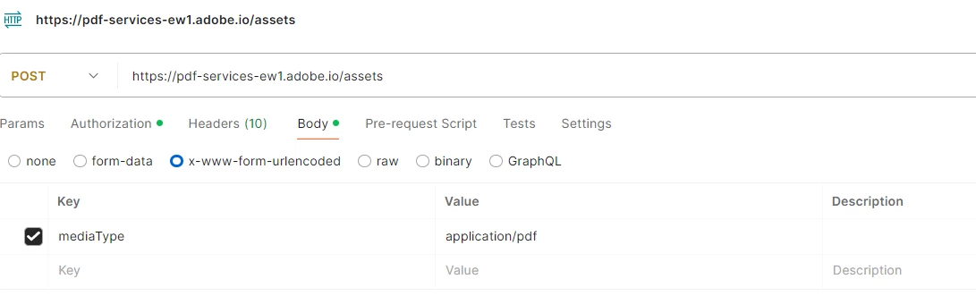 I have made a POST call to https://pdf-services-ew1.adobe.io/assets