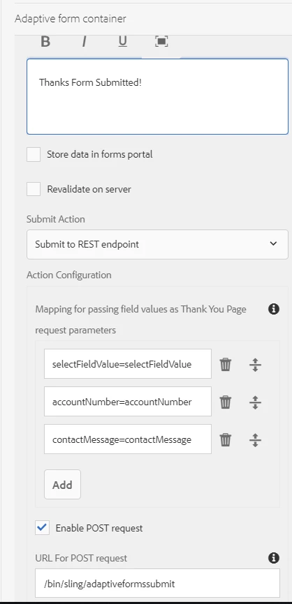 I am trying to submit an adaptive form with three fields to an internal servlet /bin/sling/adaptiveformssubmit