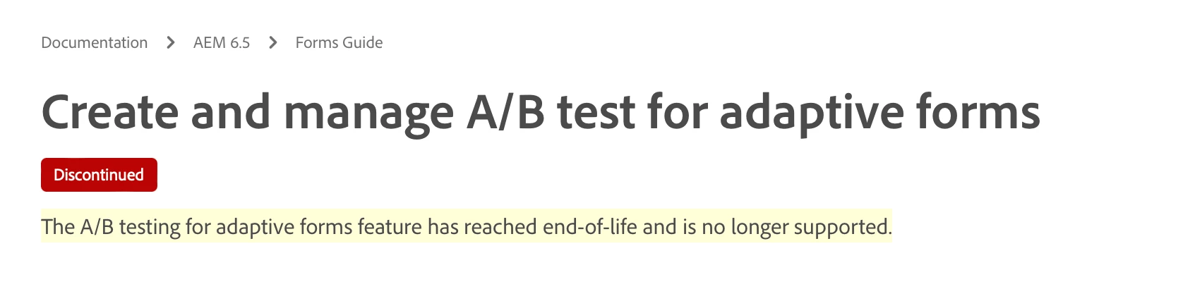 I was going through the Adobe Documentation for A/B testing on AEM Forms it surprisingly caught me that they have discontinued the feature.