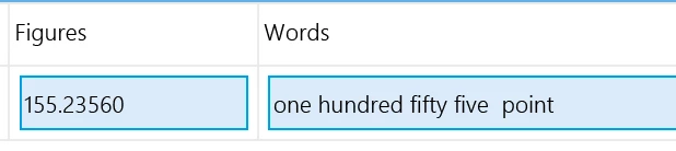 Hello - I am sure this is easy, but I can't seem to find anything not related to $ and ¢.  I wish to convert a number with 5 decimal places to words - but I can't seem to find how.  It is not dollars - they are units from a managed fund - so 125.62365 for example.  Is this possible?
