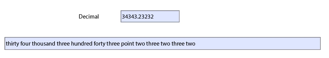 function toWords(s){s = s.toString(); s =s.replace(/[\, ]/g,''); if (s != parseFloat(s)) return 'not a number'; var x =s.indexOf('.'); if (x == -1) x = s.length; if (x > 15) return 'too big'; var n = s.split(''); var str = ''; var sk = 0; for (var i=0; i < x; i++) { if((x-i)%3==2) {if (n[i] == '1') {str += tn[Number(n[i+1])] + ' '; i++; sk=1;} else if (n[i]!=0) {str += tw[n[i]-2] + ' ';sk=1;}} else if (n[i]!=0) {str +=dg[n[i]] +' '; if ((x-i)%3==0) str += 'hundred ';sk=1;} if ((x-i)%3==1) {if (sk) str += th[(x-i-1)/3]+" ";sk=0;}} if (x != s.length) {var y = s.length; str = str.substring(0, str.length - 1); str +="point "; for (var i=x+1; i<y;i++)str.replace(/\s+/g,' ');} var deci = s.split(".")[1]; var deciword = ""; for(var i=0;i<deci.length;i++) if(deci[i]=="0")deciword=deciword+dg[0]+" "; else if(deci[i]=="1")deciword+=dg[1]+" "; else if(deci[i]=="2")deciword+=dg[2]+" "; else if(deci[i]=="3")deciword+=dg[3]+" "; else if(deci[i]=="4")deciword+=dg[4]+" "; else if(deci[i]=="5")deciword+=dg[5]+" "; else if(deci[i]=="6")deciword+=dg[6]+" "; else if(deci[i]=="7")deciword+=dg[7]+" "; else if(deci[i]=="8")deciword+=dg[8]+" "; else if(deci[i]=="9")deciword+=dg[9]+" "; return str+deciword;}