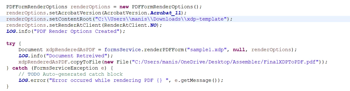 I need to create a blank interactive PDF without XML data from XDP in forms OSGI. I tried using formsService API but got some errors inside log. Please suggest or share some best references.