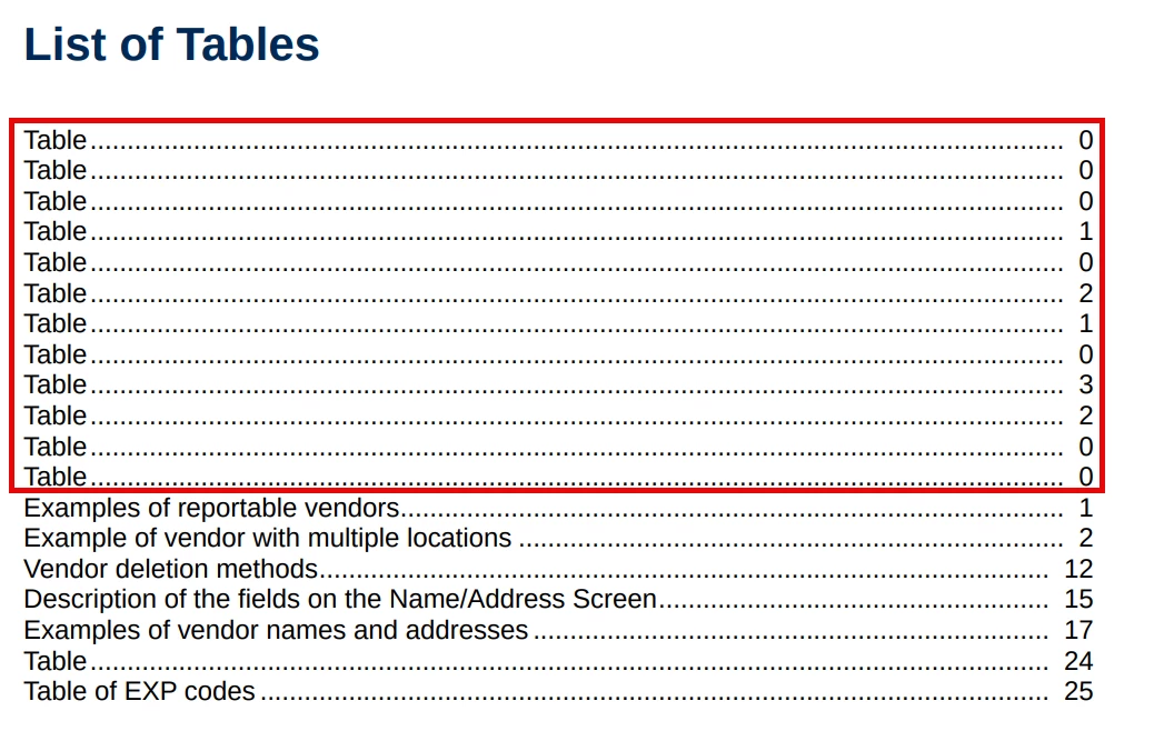 AEM Native PDF: List of Tables Showing Extra Tables at Beginning