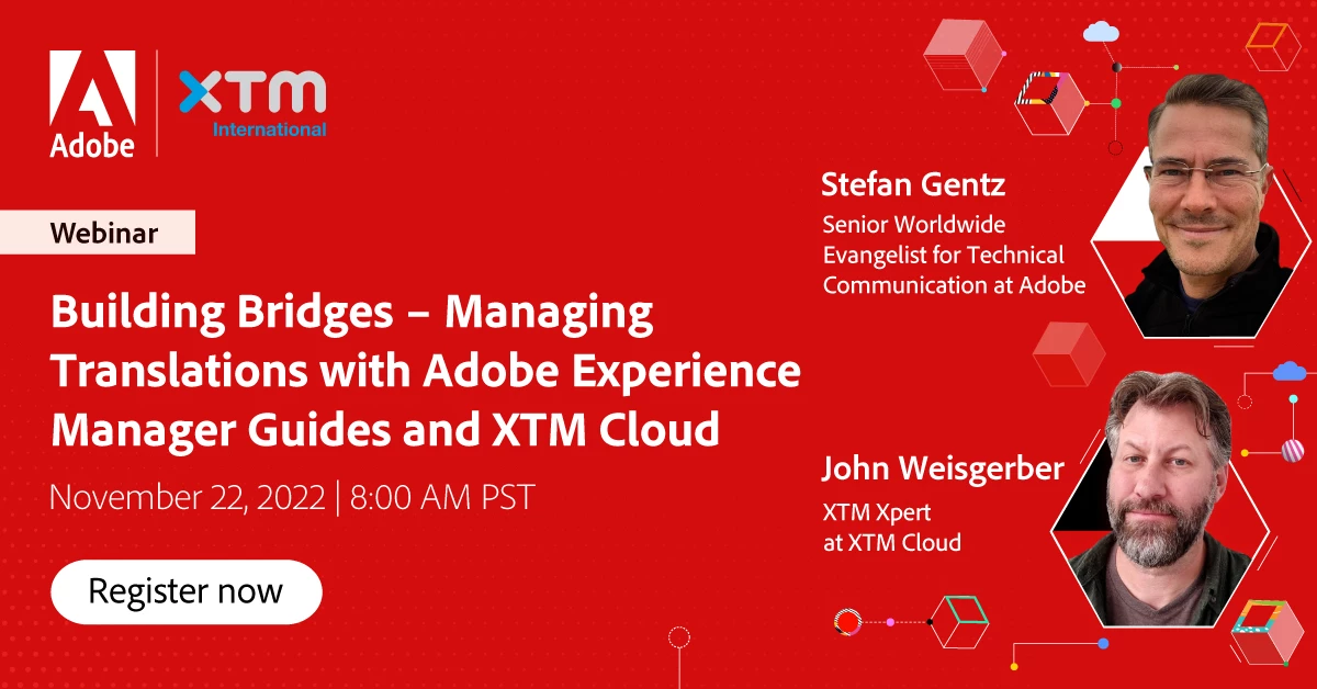 Join our upcoming webinar with XTM Xpert John Weisgerber and Adobe Technical Communication's Evangelist Stefan Gentz on November 22 at 8 am PT to learn everything you need to know about connectivity, DITA, digitalization, and more. Discover the path to a faster and better translation journey with Adobe Experience Manager Guides and XTM Cloud!