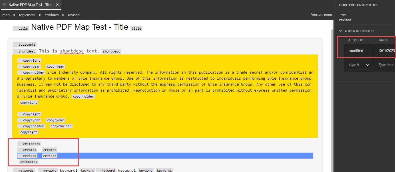 I'm trying to pull a revised critdate value from a ditamap into a Native PDF template. I've been able to pull in other metadata, but I've tried several iterations here and I'm not having any luck.