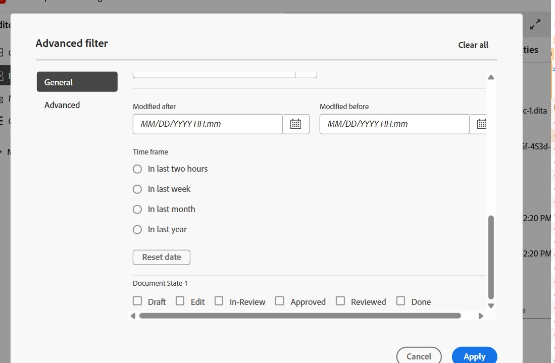 We added filters in the Folder Profile ui_config.json file. First, added the filters in the "browseFilters" section, and it's not coming in the editor. Then added filters in "repositoryFilters" section. Now the filters are appearing in the Advanced Filter popup like below
