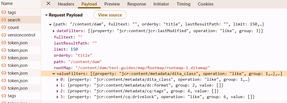 However, when applying these custom filters, the search results are not coming based on that. When inspecting the network call on clicking Apply, in the request payload, only the OOTB filters are going and not our custom filters.
