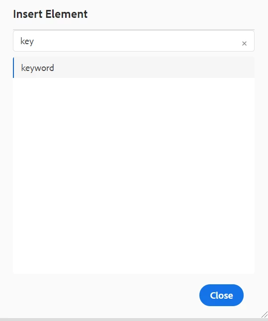 - As shown in screenshot, a small window will appear from where keywords can be chosen. This will show when you add the “keyword” element.
