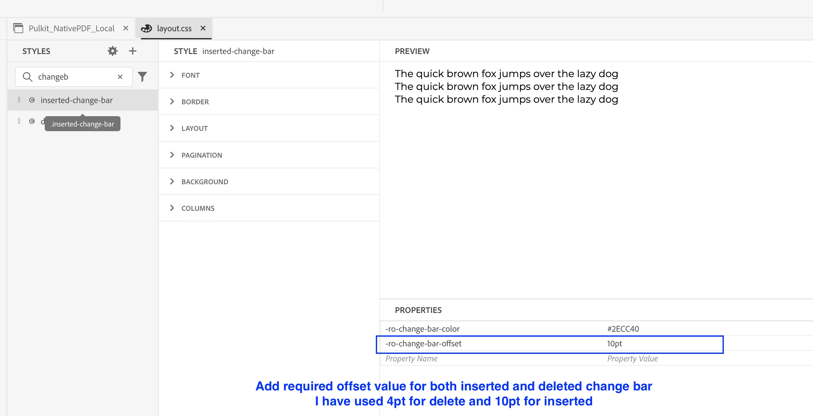 In Native PDF you can do this too, and there are OOTB templates with styles to display the bars. However, the green bar, unlike in the Guides editor, always overwrites the red bar. The only styles that I see for this bar are as follows: