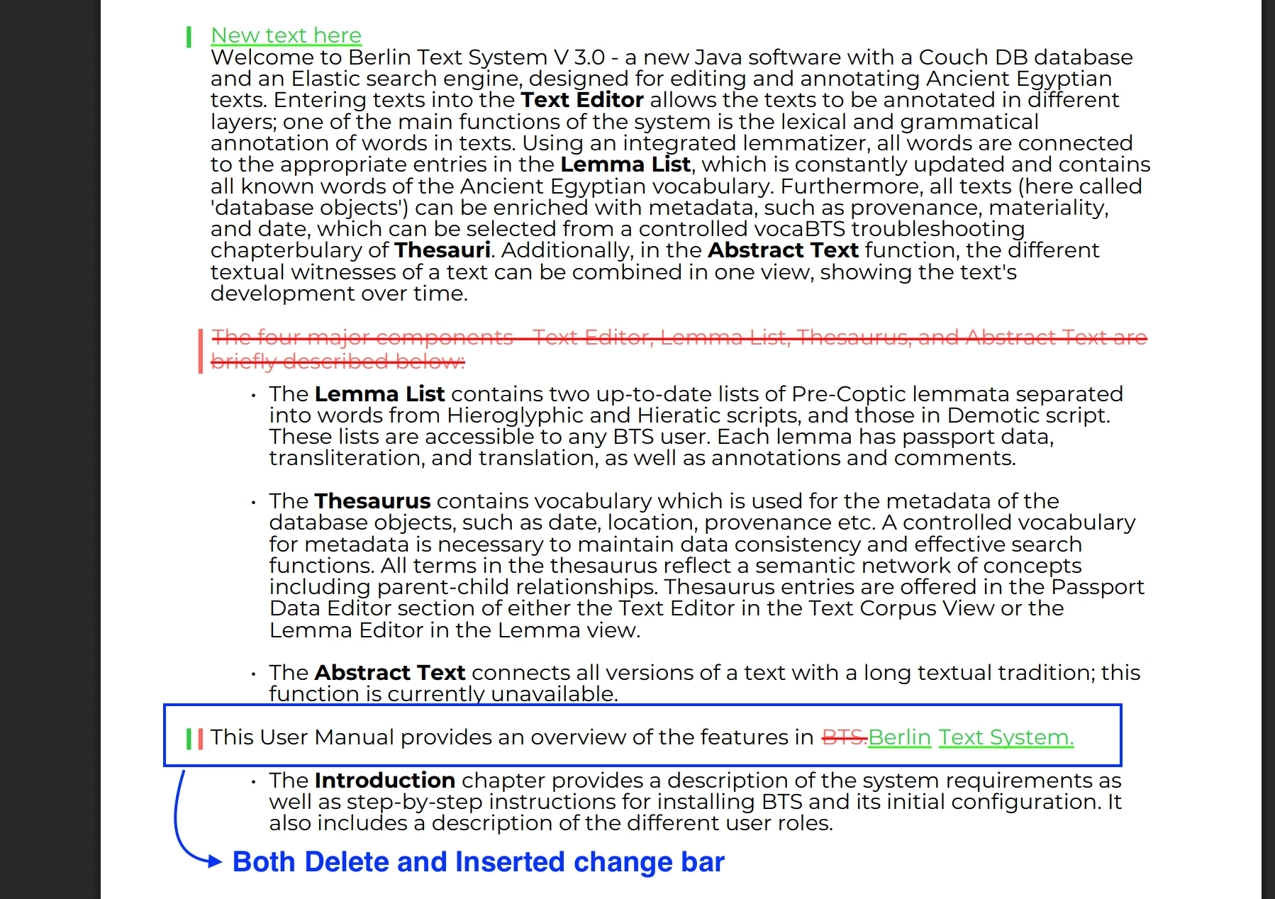 Guides allows the ability to view the differences between versions of the same topic. In this view there are red and green bars indicating additions and deletions. They are displayed side by side in the left margin in the location the change was made.