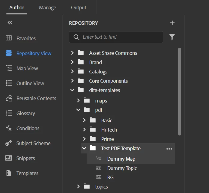 I have created a new folder "Test PDF Template" under dita-templates/pdf where we had 3 folders (Basic, Hi-Tech and Prime) already created.