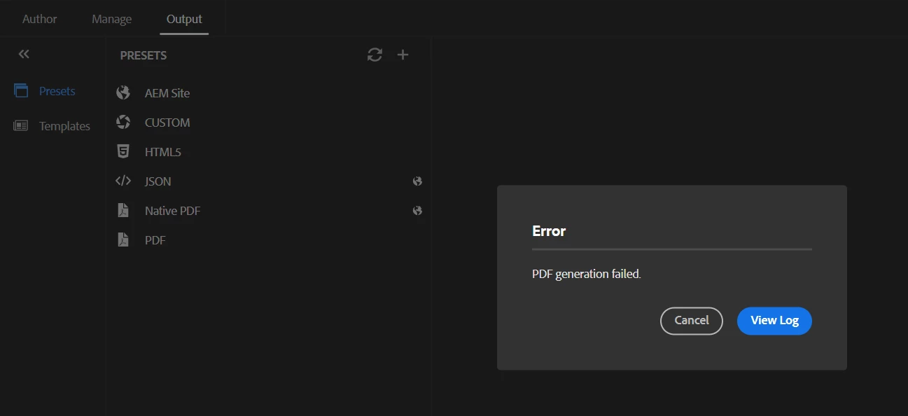 When I try to output this folder/template to PDF Preset, I get the error "PDF Generation Failed" with below logs -