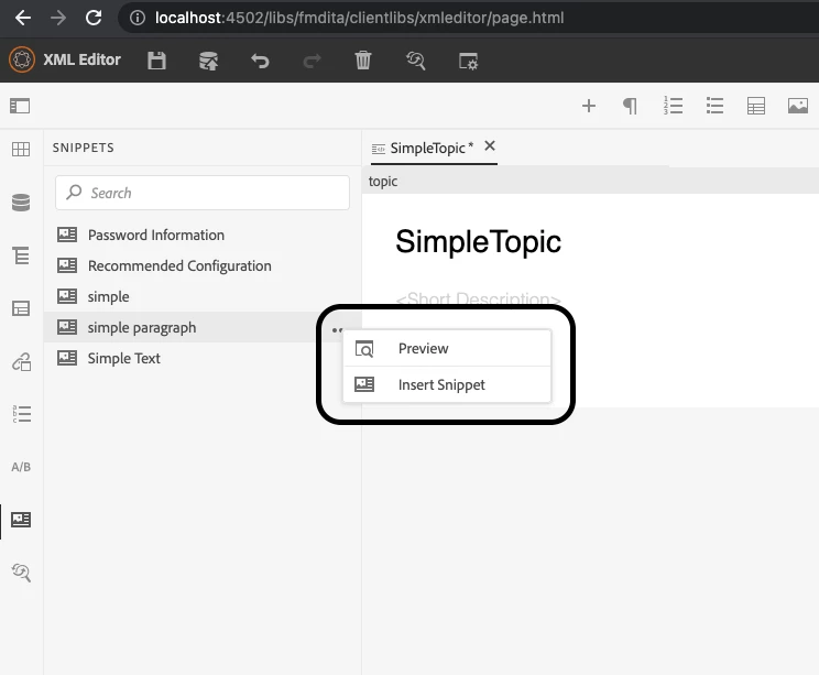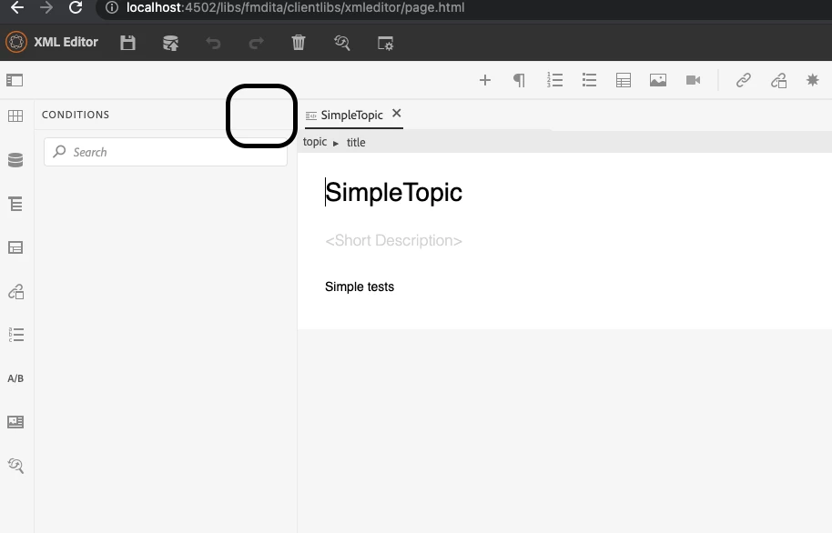 - Add/Edit Conditions, Snippets and Glossary in XML Editor tool (http://localhost:4502/libs/fmdita/clientlibs/xmleditor/page.html).