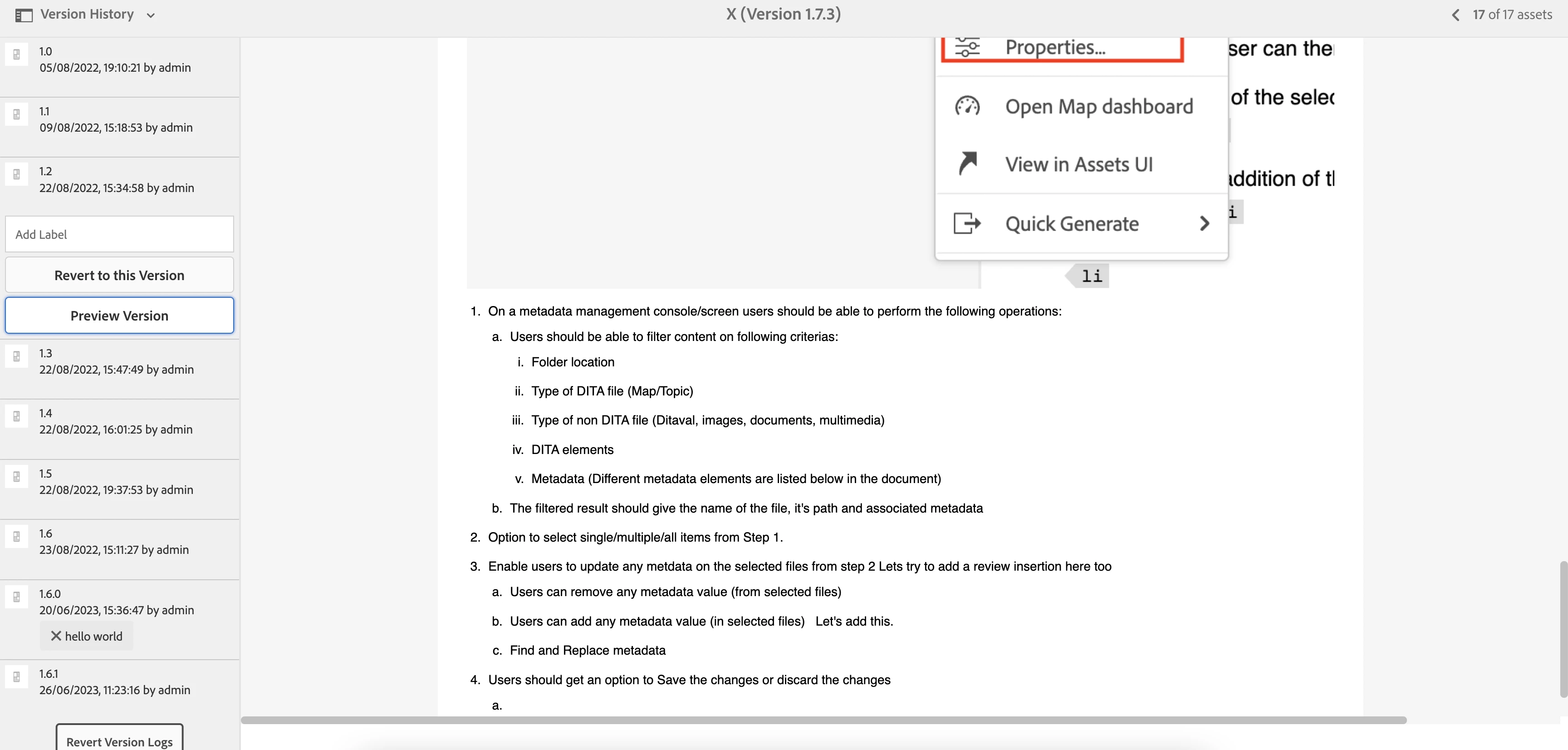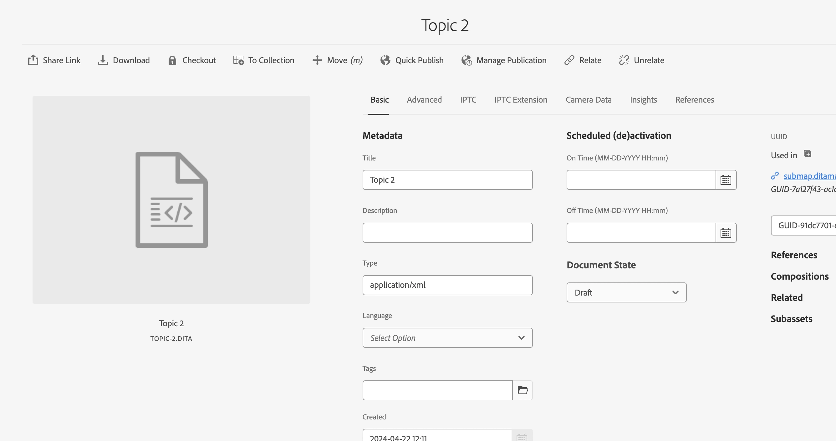 In the Assets > Properties view, DITA content doesn't preview like it does for images. Should something be displaying here? And if not, it would be nice to get that preview working for DITA content.