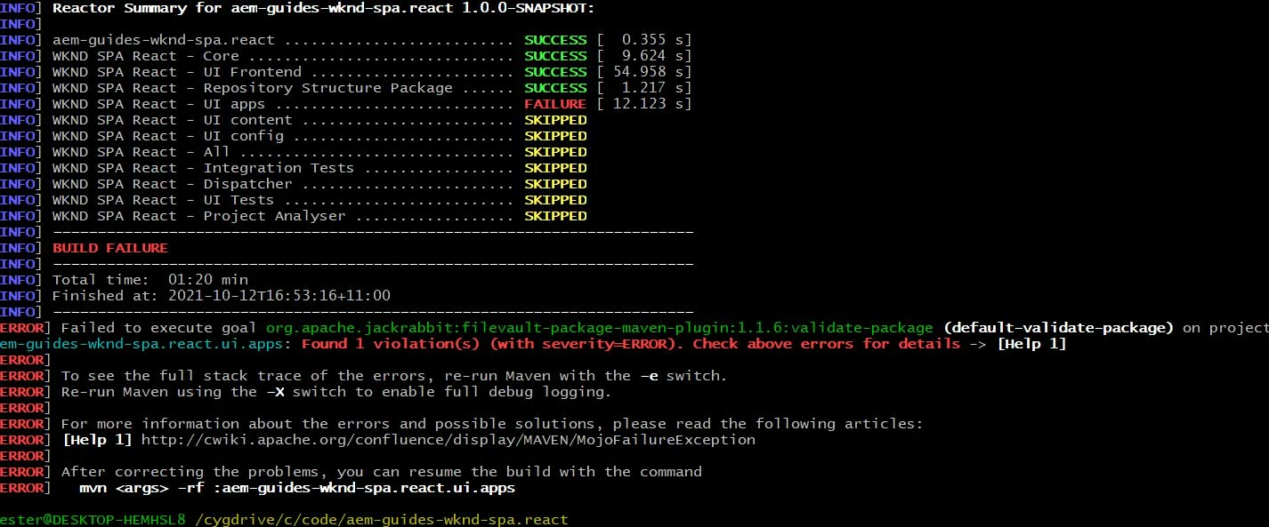 aem-guides-wknd-spa.react.ui.apps: Found 1 violation(s) (with severity=ERROR). Check above errors for details -> [Help 1]